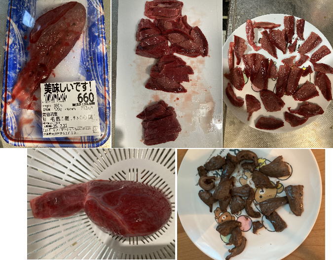 心臓半分で660円也〜。水洗いすると手が血まみれ。殺人でも犯したような光景となる。
